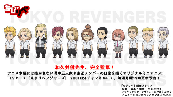 2021.4.12 NEWS オリジナルミニアニメ「ちびりべ」公開! 4月より放送開始したTVアニメ『東京リベンジャーズ』のオリジナルミニアニメ「ちびりべ」が公開です! 和久井健先生、完全監修!アニメ本編には描かれない、溝中五人衆や東卍メンバーの日常を描きます! 毎週月曜日19時公開です!ぜひチェックしてください 「ちびりべ」はこちら!
