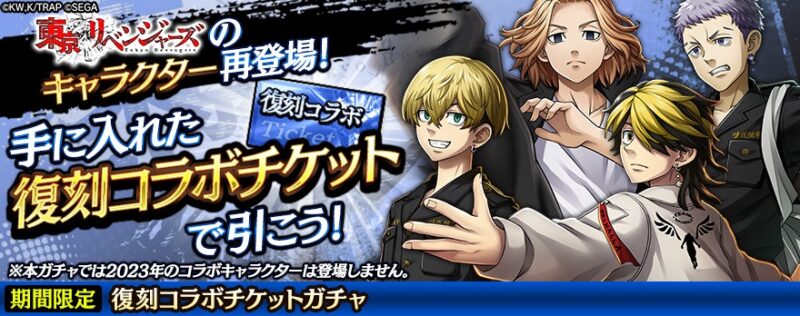 KSR「佐野 万次郎」をはじめ、前回のコラボで登場した人気キャラクター達が再登場!コラボ期間中に獲得できる「復刻コラボチケット」で引くことができます。