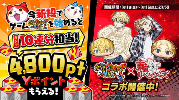 コラボ期間中に『妖怪ウォッチ ぷにぷに』を始めた人を対象に、Yポイント4,800ptをプレゼント!