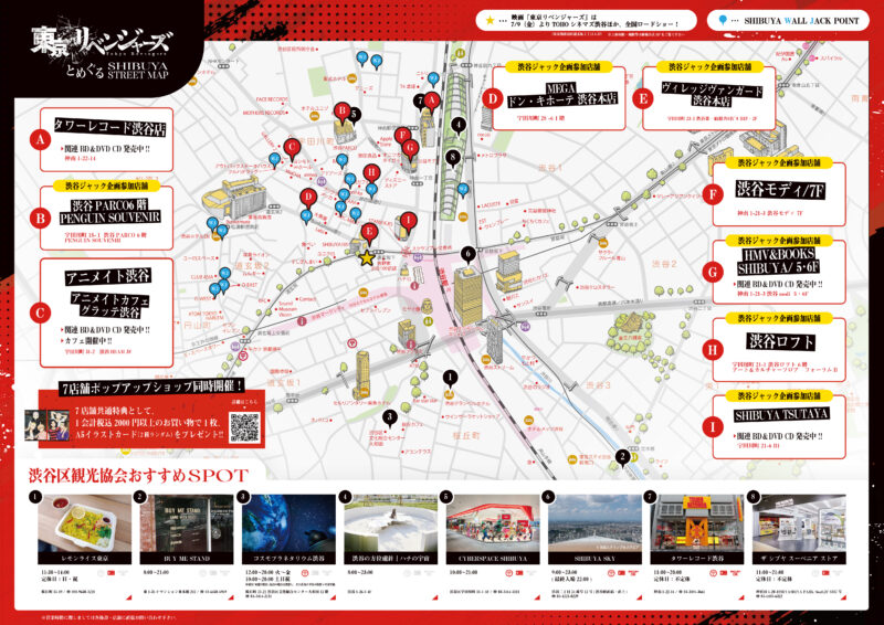 2021.6.19 NEWS 「『東京リベンジャーズ』とめぐるSHIBUYA STREET MAP」を配布! 渋谷区観光協会のご協力により「渋谷ショップジャック」・「SHIBUYA WALL-JACK」等を行っている場所を記載した「『東京リベンジャーズ』とめぐるSHIBUYA STREET MAP」を配布! ぜひお近くへお立ちよりの際はMAPをお手にとってみてください! ※MAPに不備がありましたので、修正版を掲載いたしました(7月15日更新) 配布期間:7月1日(木)~なくなり次第終了 配布場所:渋谷駅ハチ公前広場 観光案内所、SHIBU HACHI BOX渋谷マークシティ内 渋谷区観光協会